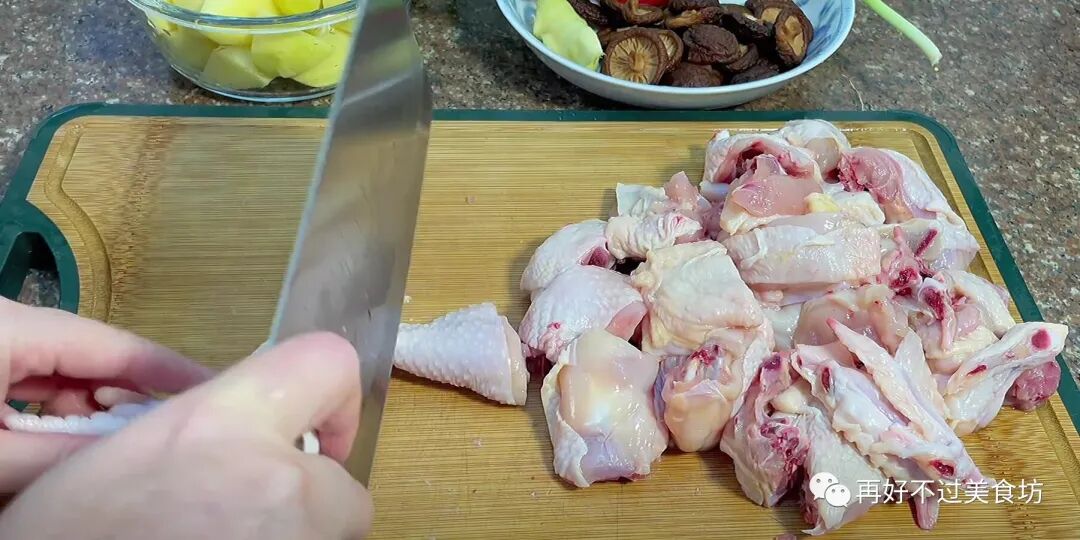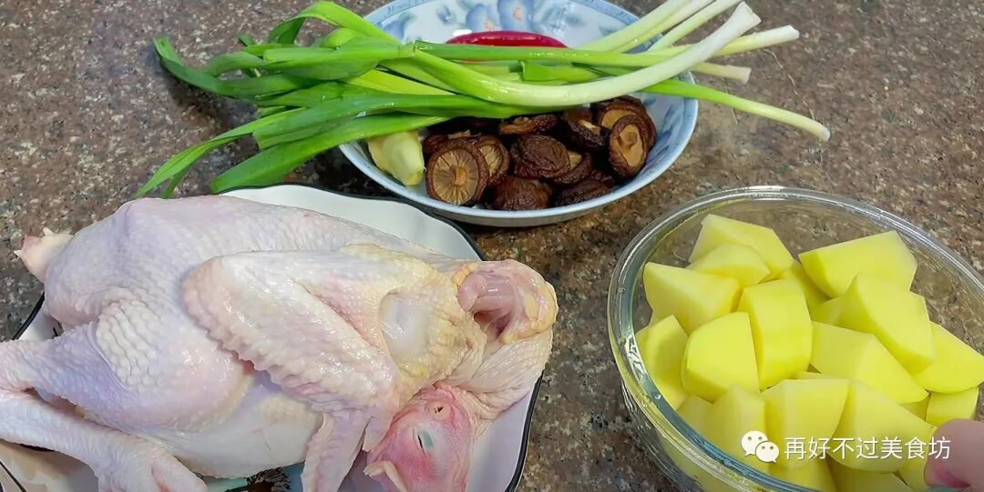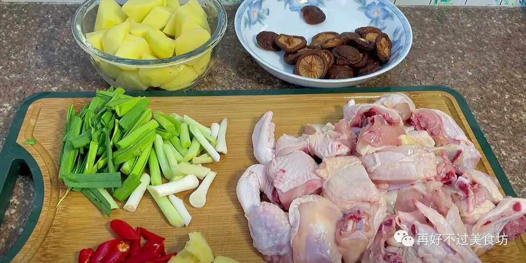 主要食材:鸡、土豆、香菇、蒜苗、生姜、小米辣