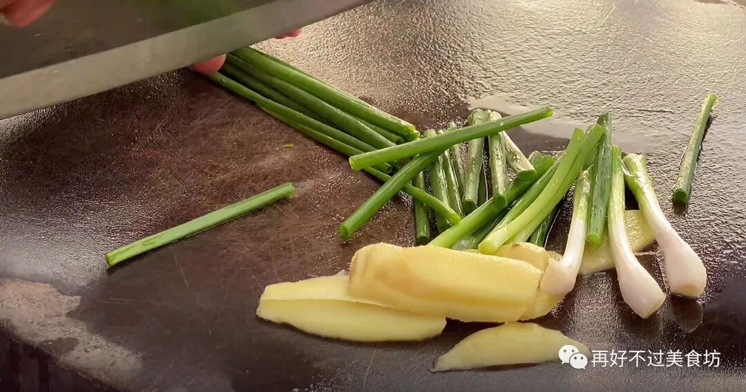 3、这个时候,我们来切一些姜片和葱段,然后再切一些葱花,全部切好后,给它放在一旁备用。