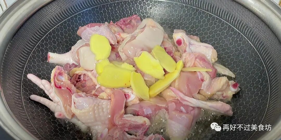 3、起锅烧油,油要稍微多一点,然后把鸡肉和生姜同时下锅,用铲子不停地煸炒,直到炒到鸡皮微微有点焦黄,一般我都会煸炒个五分钟左右。