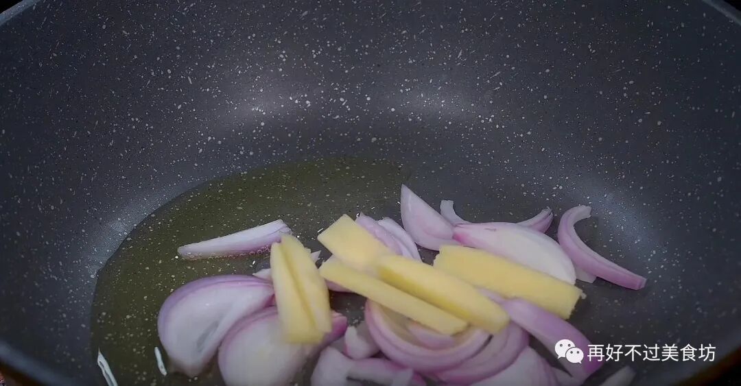 9、另外准备一口锅,锅中倒入一点点底油,油热以后,把洋葱和姜丝放进来,把洋葱和姜片给它炒一下,炒出香味。
