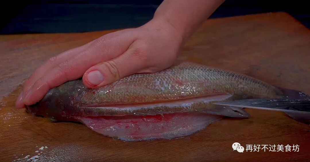 1、准备一条新鲜的鲈鱼,放到案板上,从背部给它切开,但记住不要给它切断掉了,一面切开以后,再给它翻过来,把另外一面也按照刚才的方法都给它切好,鱼尾则是直接切掉扔了。