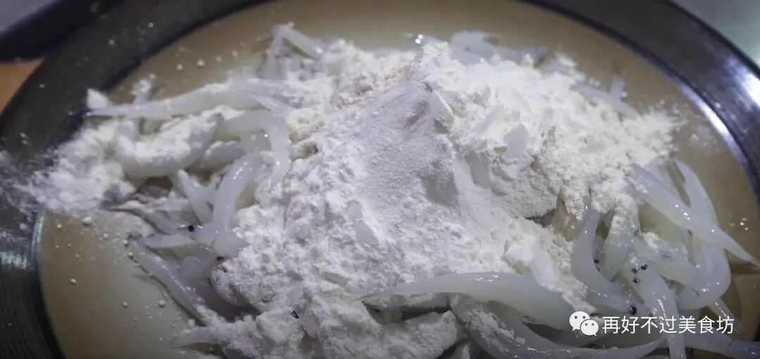 3、在沥干水分的银鱼上,加入3勺左右的油炸粉,再来上一勺生粉,就用手给它搅拌均匀,让面粉均匀地裹在每一条银鱼上。
