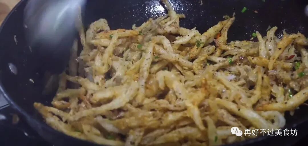 6、重新起锅烧油,加入蒜末和小米辣,等被炒出香味之后,再倒入经过油炸的银鱼,给它翻炒几下,最后撒上一点葱花点缀,你要是嫌麻烦的话,也可以直接就在上面撒一点椒盐即可食用。