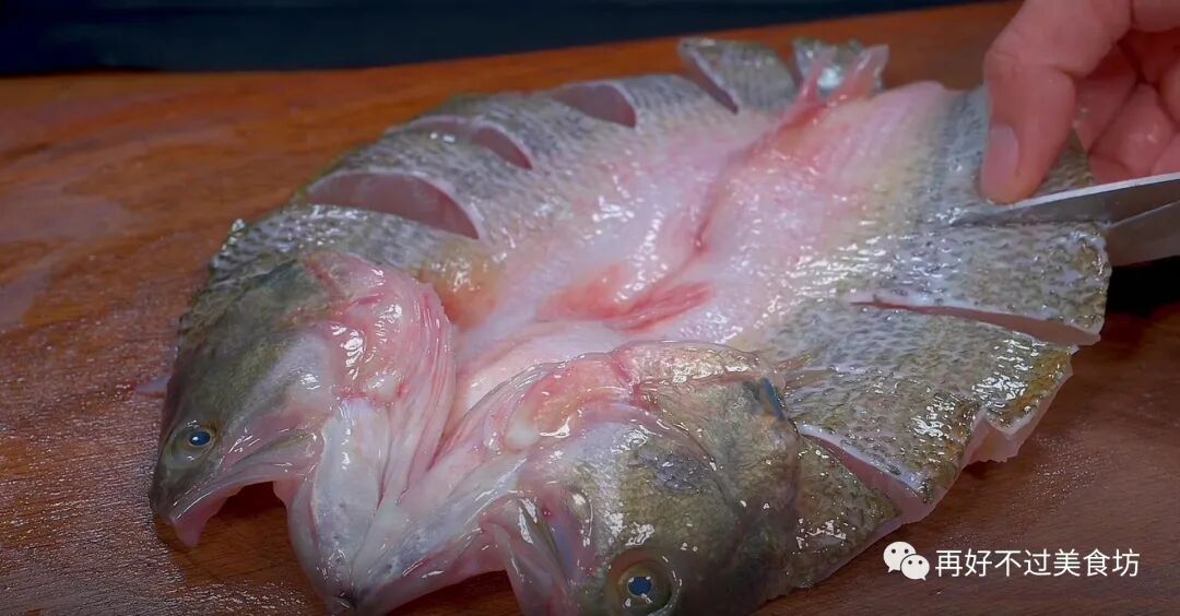 2、按照刚才切开的地方,把鱼头给它切开,再从鱼尾的地方往前面剪,把中间的鱼大骨给它剪掉,然后在鱼身上每隔2公分的地方,给它剪一下,但要记住不要剪断,剪到鱼腹的地方就可以了。