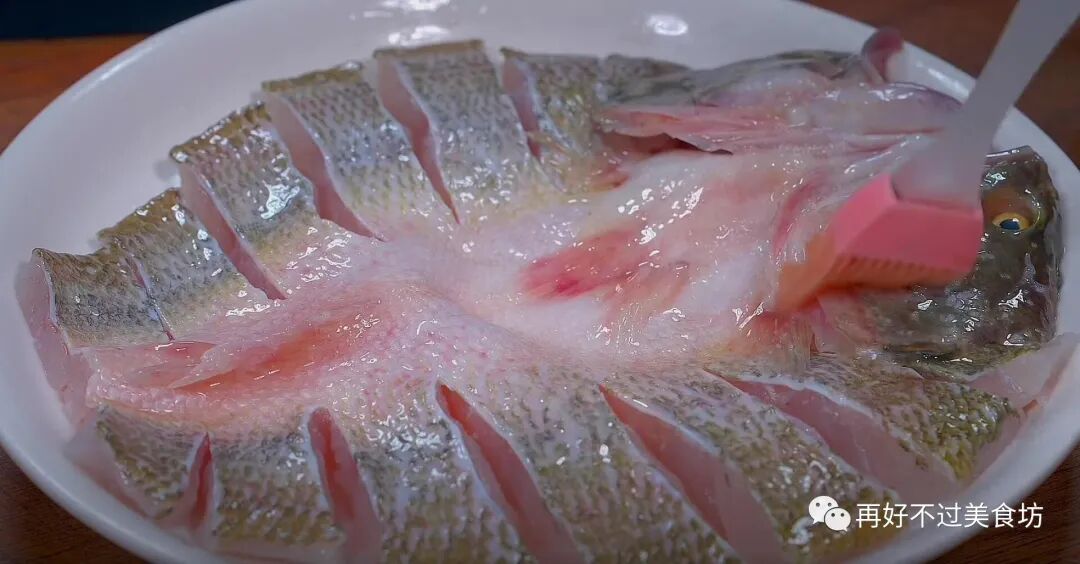 7、把腌制好的鱼,给它拿出来,然后把它平铺在蒸盘的里面,我们在腌制鱼的时候,切记不要放盐,等到要上锅蒸的时候,再在上面抹一点点毛毛盐就行了,然后刷上食用油,刷上食用油能够锁住水分,蒸出来的鱼就会很鲜嫩。
