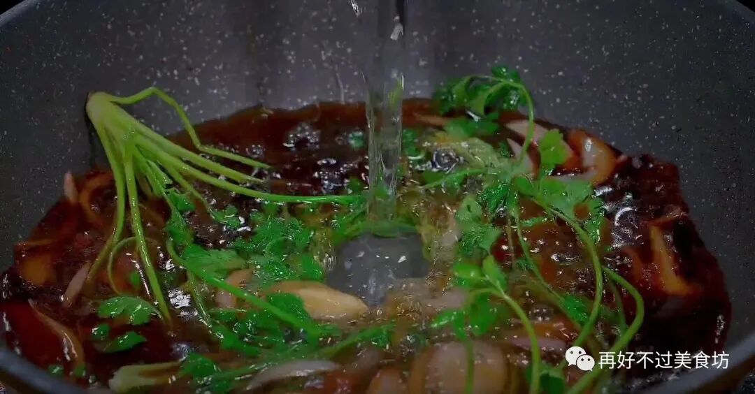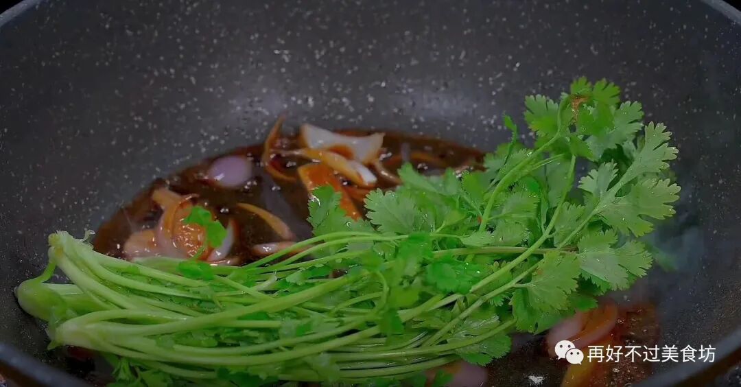 10、接着加入半勺生抽、酱油,再来一勺蒸鱼豉油,大概一汤匙的蚝油,然后把香菜也放进来翻炒一下,炒出酱香味。