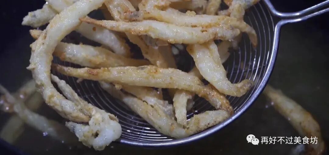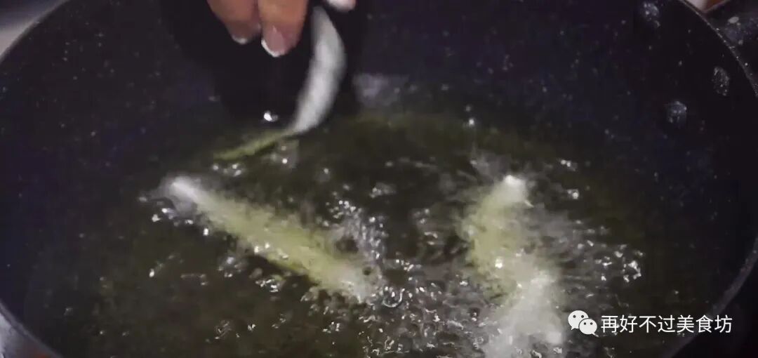 4、等银鱼上都均匀地裹上面粉之后,就要马上开始油炸,并且要一条一条的放入锅中油炸,这是做这道菜的重点。