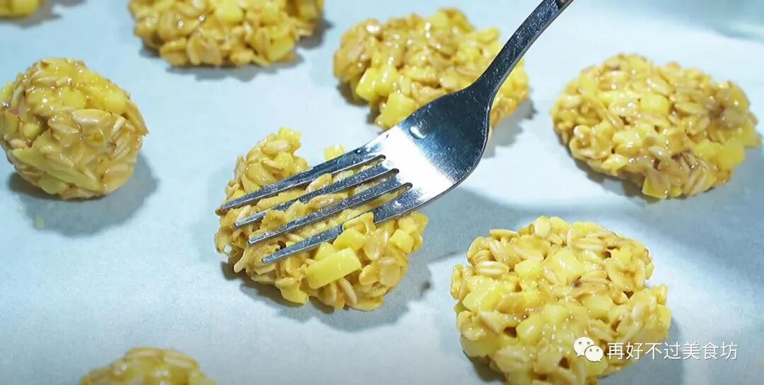 7、全部捏好后,放入提前铺好吸油纸的餐盘里,间隔尽量放开一点,再用叉子按压成小饼,这个过程要细心一点,不要压破了。