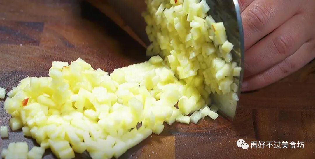 4、准备一个苹果,去皮后切成薄片,再切成细丝,最后改刀切成大小均匀的小颗粒,全部切好后和燕麦放在一起。