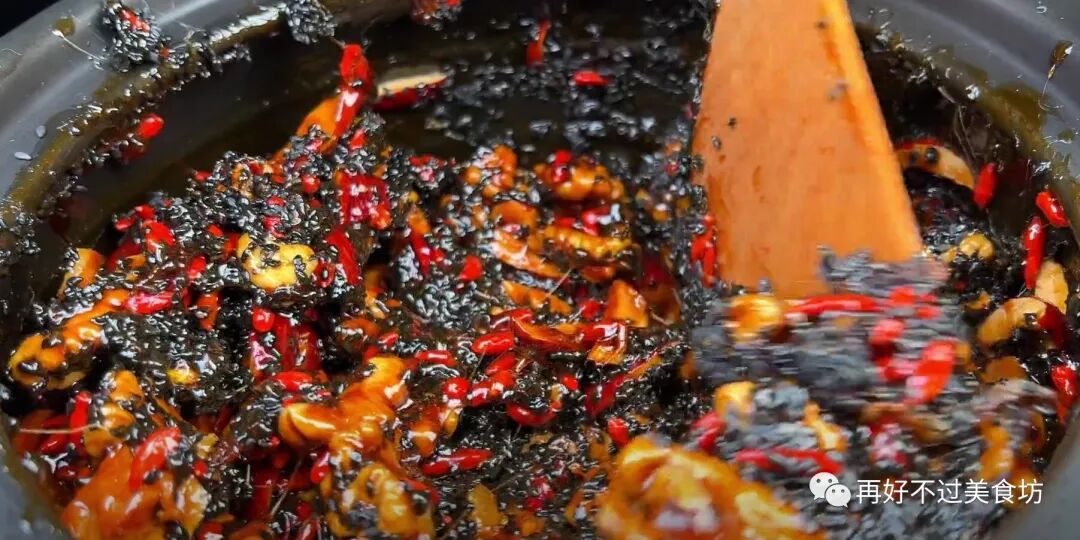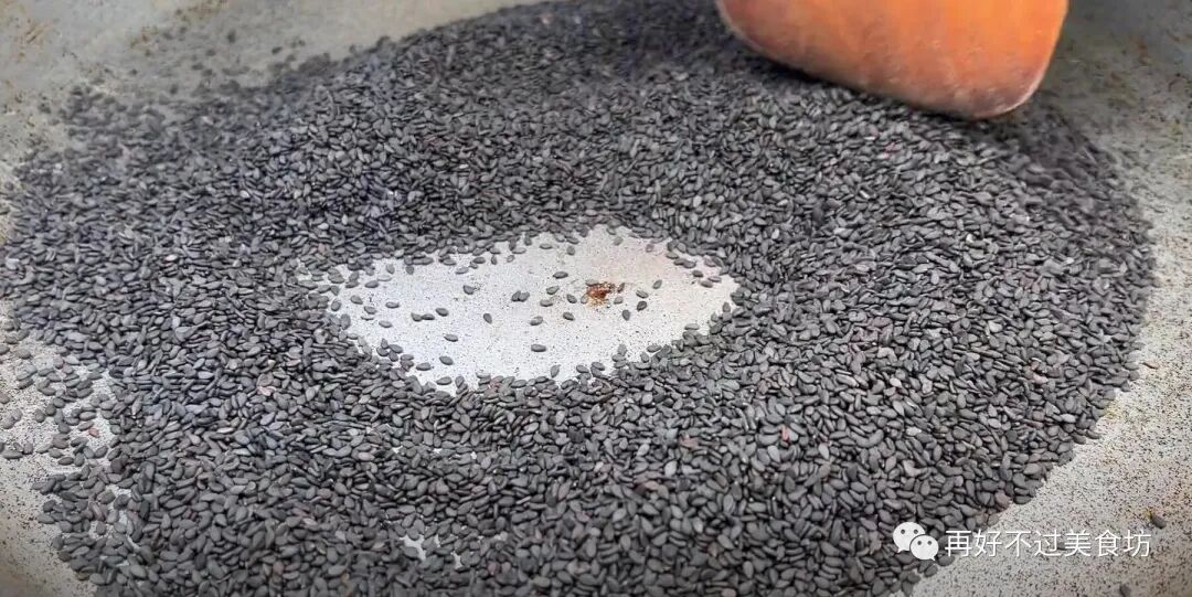 10、最后倒入炒好的黑芝麻,给它继续翻拌均匀,搅动起来比较费力,它的胶质非常丰富,所以必须要分批搅拌。