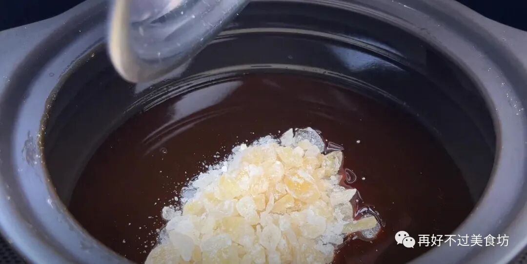 8、阿胶泡好以后,直接将阿胶连锅一起端到灶台上,然后再加入100克黄冰糖,用小火熬,中间不停搅动,防止它粘锅底,全程都用小火熬,时间大概要半个小时左右。
