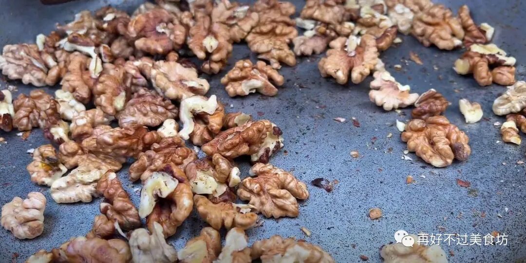 7、下面把剥好的核桃也炒一下,炒核桃则需要十分钟左右,炒好后,也放在盘子里备用。