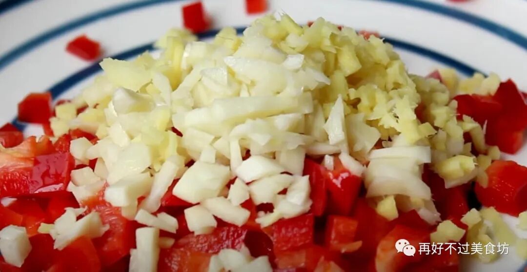 5、准备一个红椒,对半切开,最后切成小碎丁,一块生姜,先切片,最后切成姜末,再来几瓣大蒜,把它切成蒜末,然后将三者放在同一个盘子里备用。
