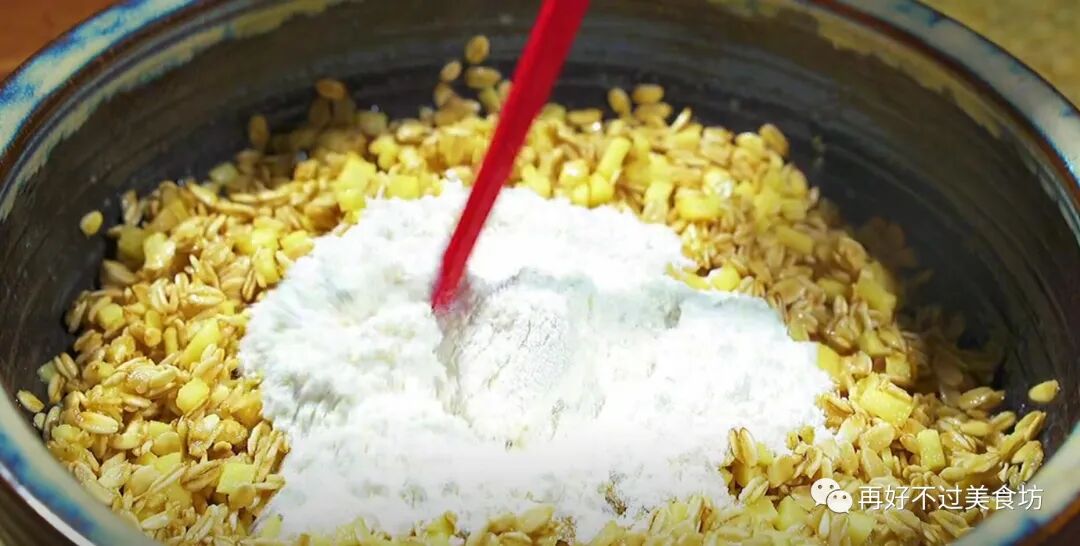 5、接着加入一勺白糖,倒入50克的纯牛奶,搅拌均匀,让燕麦充分地吸收牛奶,最后加入70克的低筋面粉,再次充分搅拌均匀就可以了。