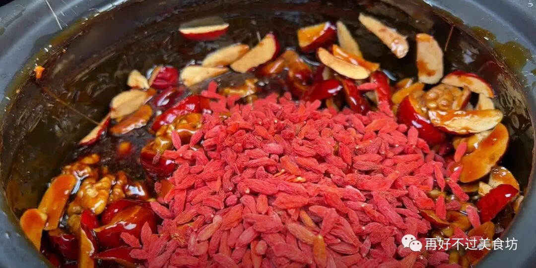 9、半个小时以后,阿胶呈现挂旗状态,这个时候关火,倒入核桃仁、红枣,先给它翻拌均匀,再倒入桂圆、枸杞,再次翻拌均匀。