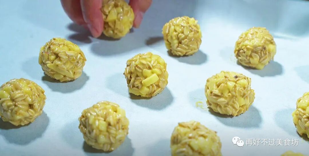 6、捏下一小坨燕麦,可以在手套上抹点食用油防粘,先捏紧实,然后揉成大小相同的小球,大小可以根据自己的喜好来捏。