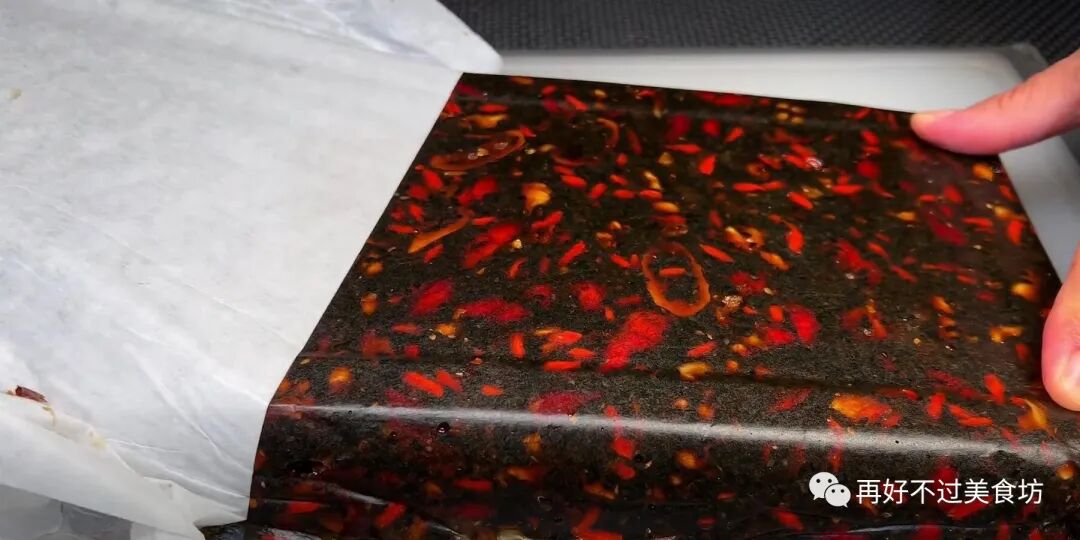 11、全部搅拌均匀以后,快速倒入油纸里面,先用手给它压紧,这样方便定型,再用刮板压平整一些,放到自然冷却就可以了。