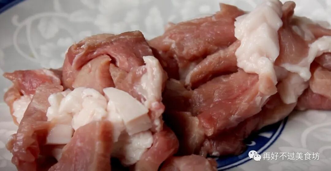 4、下面准备一块猪肉,把它切成薄片,切好之后,给它放在盘子里面备用。