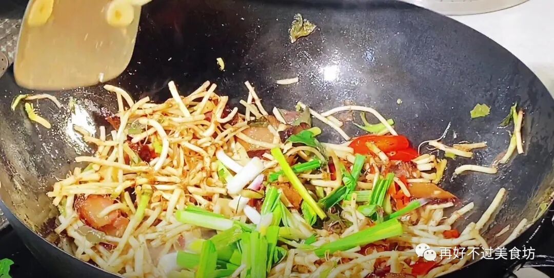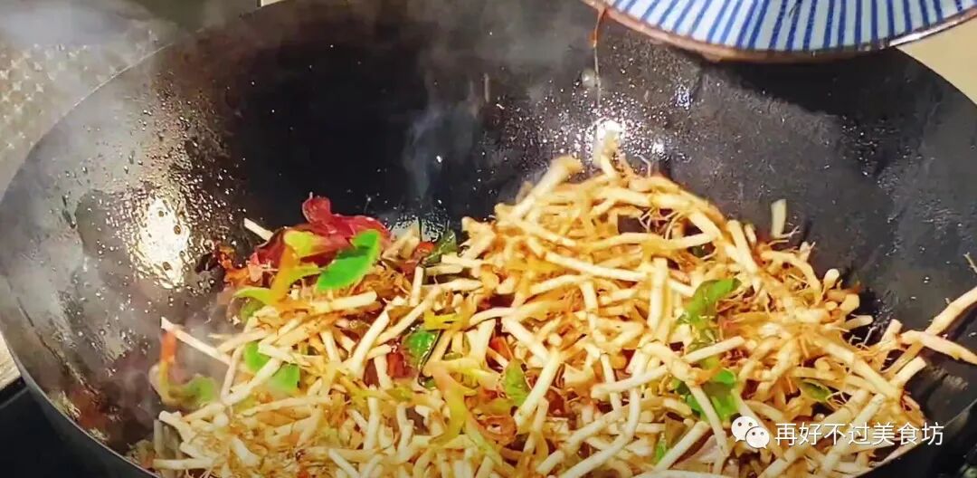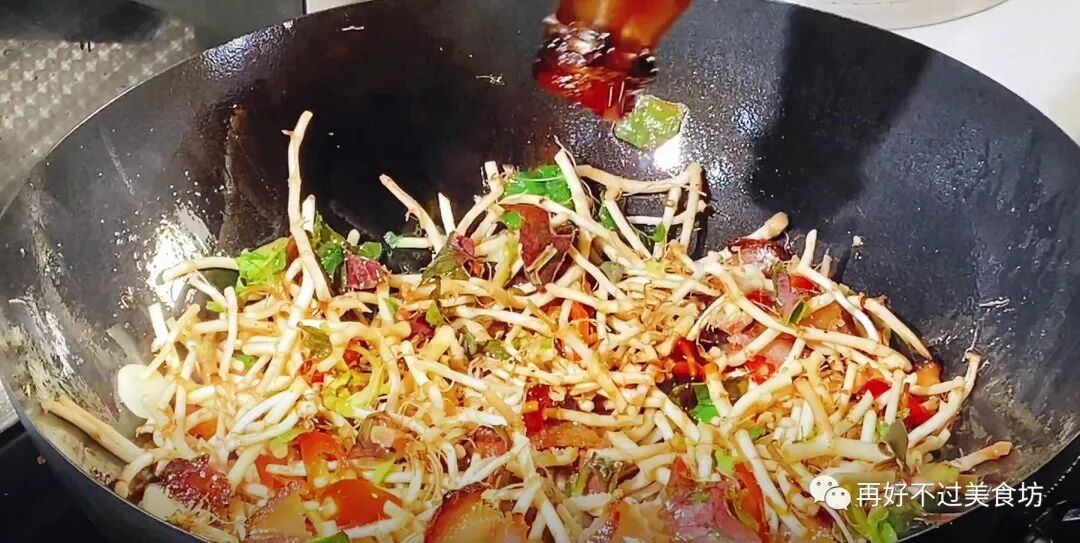 8、鱼腥草加进来以后,炒制的时间切记不能太久,加半勺食盐,少许的生抽,再来点蚝油,快速的翻动一下,把所有的食材给它炒至入味上色。