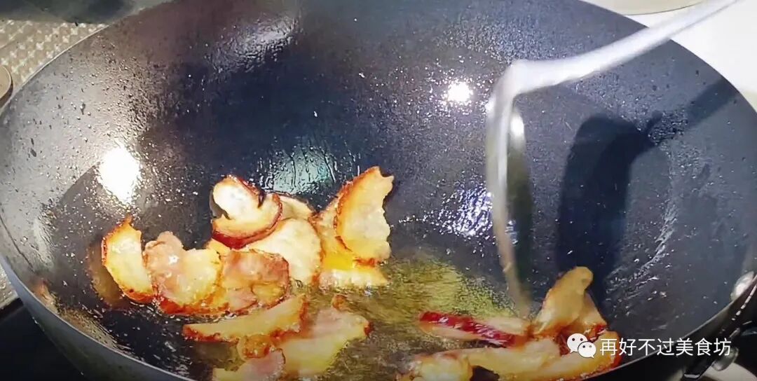 6、把锅烧至冒烟,再加适量的混合油,提前把锅给它润一下,可以防止粘锅,再把腊肉给它加进来,快速煸炒一下,把腊肉给它炒至微微的泛黄,这样腊肉吃起来也会更香。