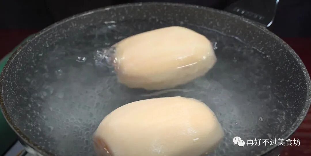 1、锅中水开后,加入一勺盐,几滴白醋,白醋可以很好地防止莲藕氧化变黑,也可以使口感更加爽脆,再把莲藕整个放进去,焯水两到三分钟,捞出放入凉水中过凉。