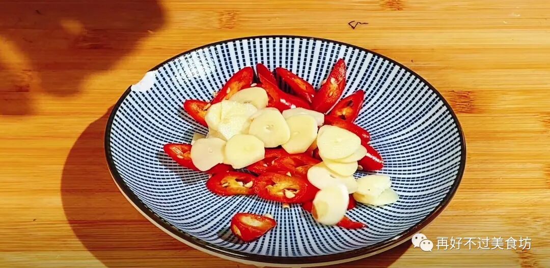 4、准备红椒一根,改刀切成小段,加入红椒既可以配色,也能够增加辣味,吃起来会更加开胃下饭,再来大蒜两颗,给它切成薄片,用来增加蒜香味,切好后和辣椒放一起备用。