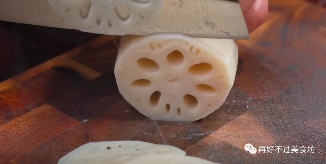 4、放凉后的莲藕,全部切成薄片,焯水后的莲藕柔韧性会非常的好,切的时候也不容易碎,全部切好后,放旁边备用。