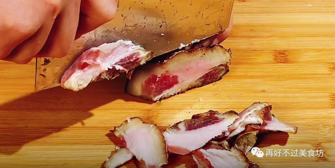 3、准备五毛钱的腊肉,改刀给它切成薄片,加入腊肉,不仅可以增加适量的荤腥,还可以有效的去除腥味,吃起来也会更香,切好以后也放入盘中备用。