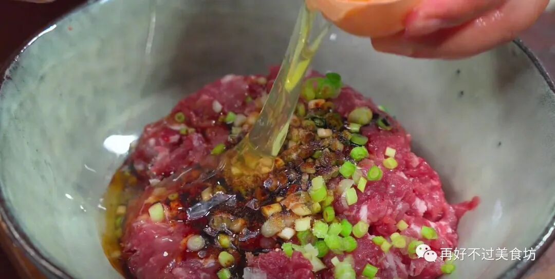 2、准备一块猪腿肉,切成小块后,再剁成肉末,放入大碗中,再加入姜粉、葱白、一点点十三香、胡椒粉去腥增香,适量盐,一勺生抽提鲜,半勺老抽上色,再加入一个鸡蛋清,蛋黄先放一旁备用。