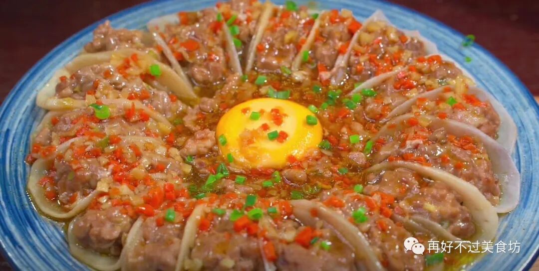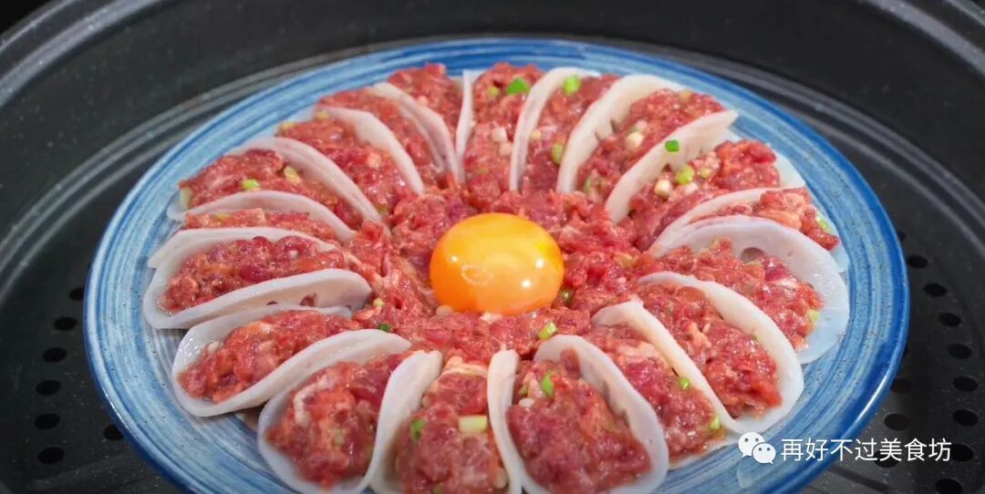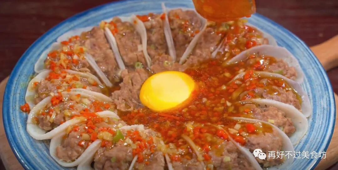 6、摆一个好看的造型,剩下的肉馅放在盘子中间,再把剩余的蛋黄倒进去,放入蒸锅,盖上盖子,水开后蒸20分钟。