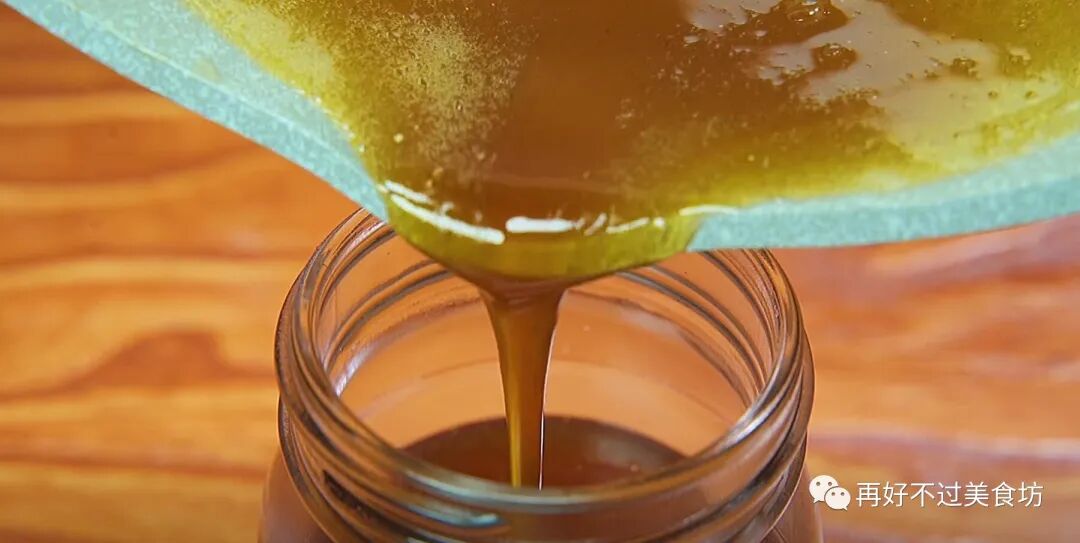 9、等它放凉至80度左右,趁热倒进干净的容器中,凉了就会变得非常浓稠,不容易倒出来,做一次可以吃上几个月。