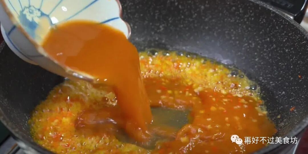 8、锅中油热后,倒入蒜末、胡萝卜丁翻炒均匀,炒出香味后,倒入调好的料汁,中火煮开,煮到有一点点粘稠,就可以关火了。