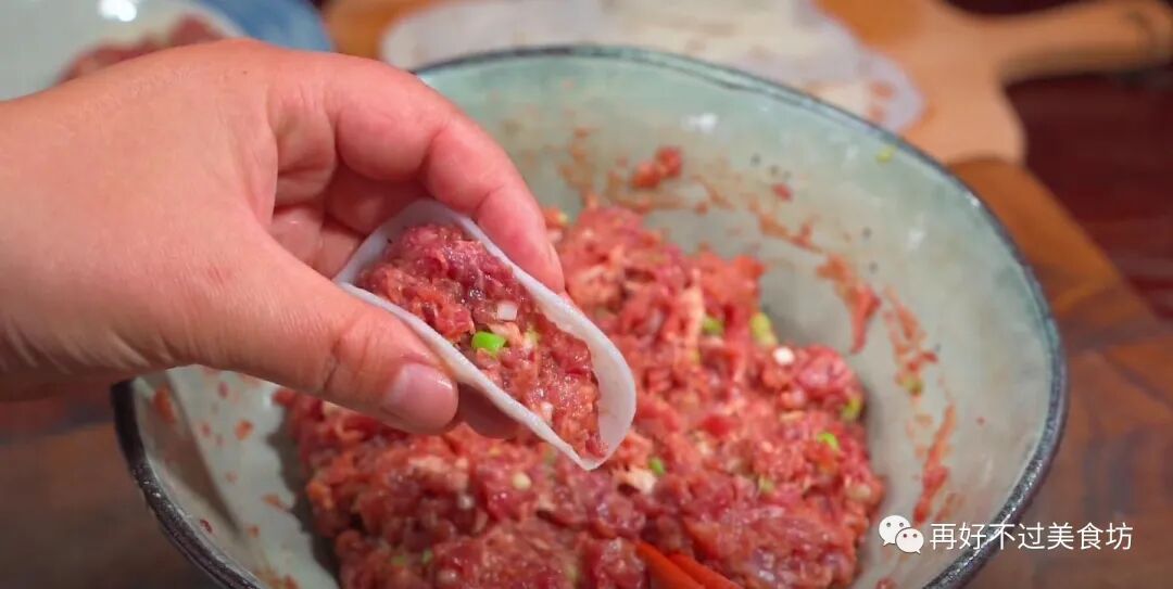 5、接着取出一片莲藕,在中间放上适量的肉馅,用手轻轻一夹,就将肉馅包起来了,做好后全部放入大盘中。