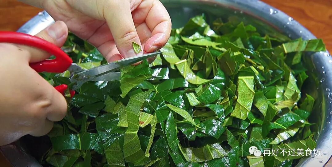 2、新鲜的枇杷叶背面,有一层薄薄的绒毛,用刷子刷洗干净,多清洗几遍,洗好后捞出,沥干水分,再将枇杷叶用剪刀剪碎,尽量剪得细一些,全部剪好后放一旁备用。