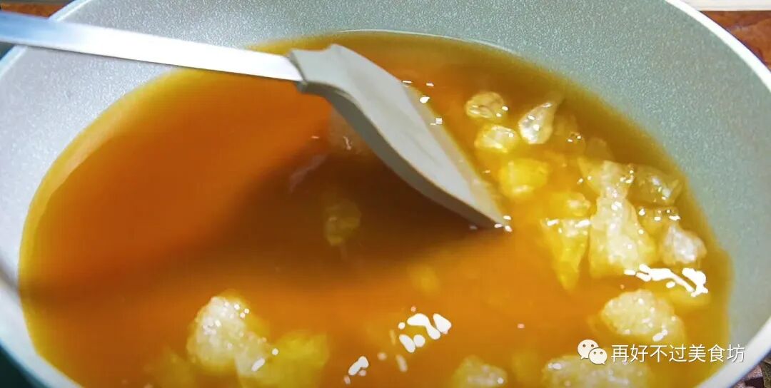 7、接着往里加入200克老冰糖,开大火煮,煮至冰糖全部融化后,转中小火慢慢煮,一开始不用管它,直到汁水慢慢变得浓稠,颜色变深。