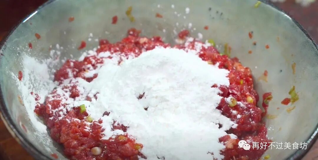 3、接着顺着一个方向充分搅拌均匀,等到完全吸收了,蛋清有点粘稠的状态,再加入一大勺红薯淀粉,这样可以使馅料口感更加嫩滑,再次搅拌均匀,先放一旁备用。