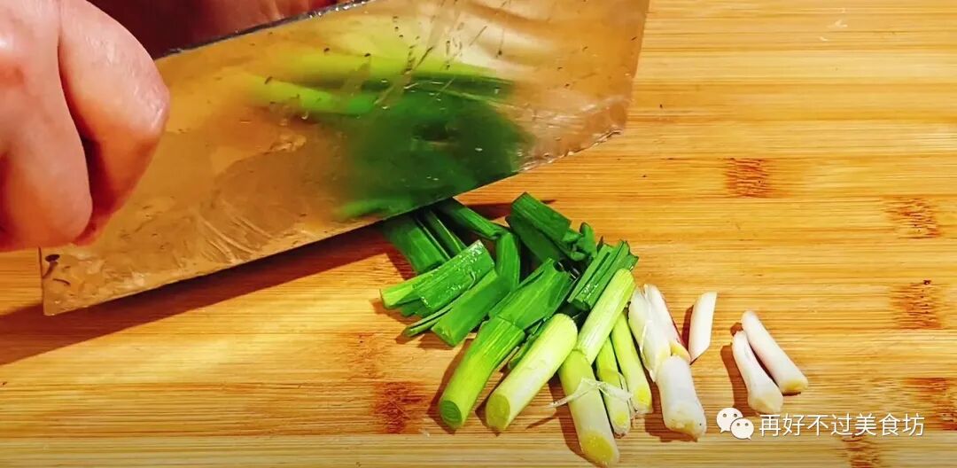 5、准备两根青蒜,斜刀给它切成小段,既可以配色,也能增加蒜香味,切好以后放入碗中备用。
