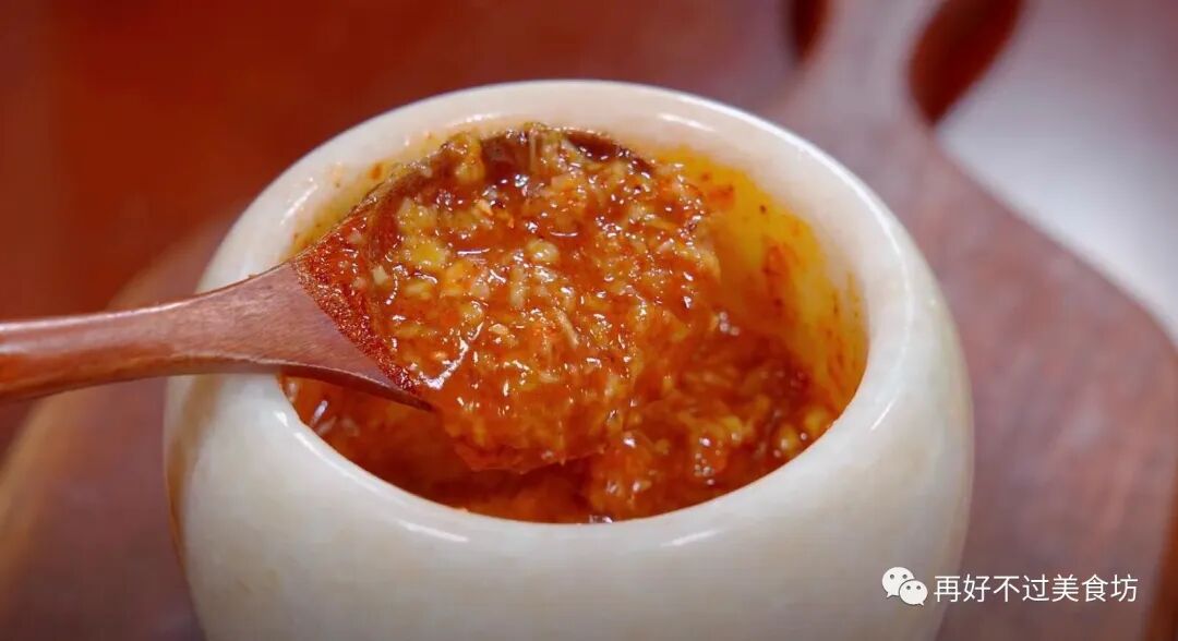4、接着来捣个蒜泥,几瓣大蒜加一勺盐,给它捣成细腻的蒜泥,然后往里面加点生抽、醋、辣椒油,一勺凉白开,适量的香油,搅拌均匀备用。