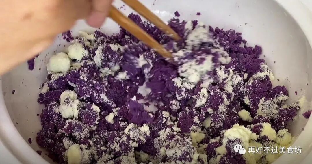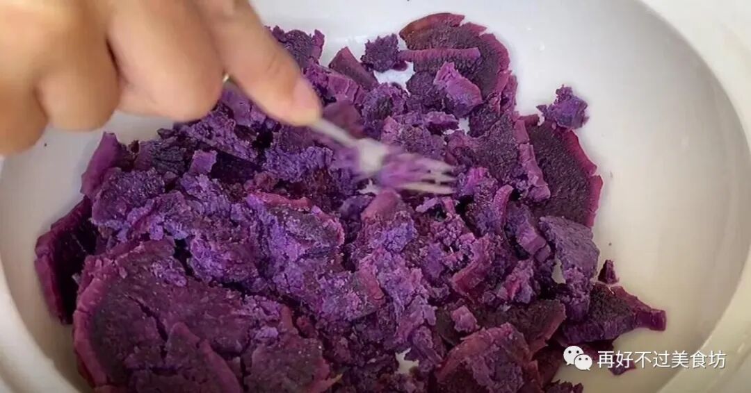 6、然后把紫薯放入一个大碗里,用叉子把紫薯压成紫薯泥,加入两勺奶粉,用筷子搅拌一下,期间加点温水进来,用筷子搅拌均匀。