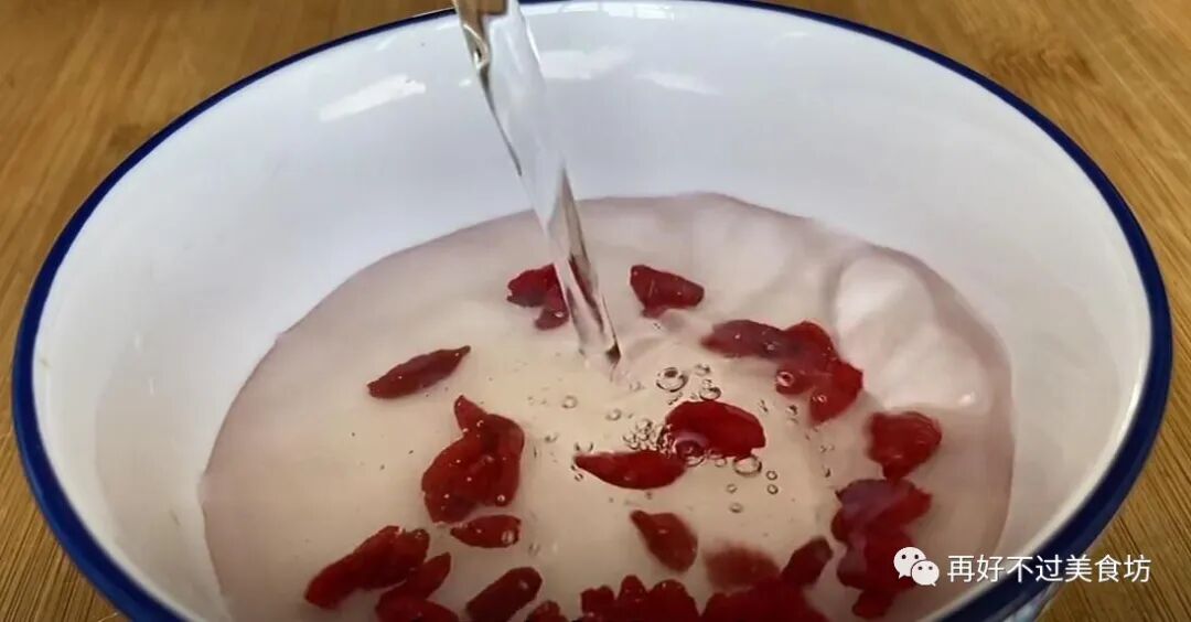 4、准备一点枸杞放入碗里,也用清水洗干净,然后把水倒掉放一旁备用。