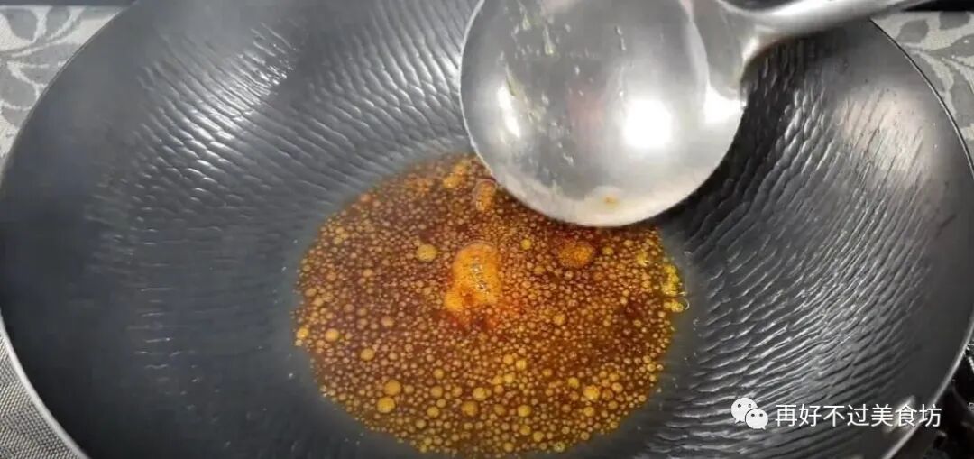 5、由于用油炒速度非常的快,掌握不好的朋友一定要开最小火,焯水后用勺子不停地搅动,使这个糖水受热均匀,最后炒成这个样子。