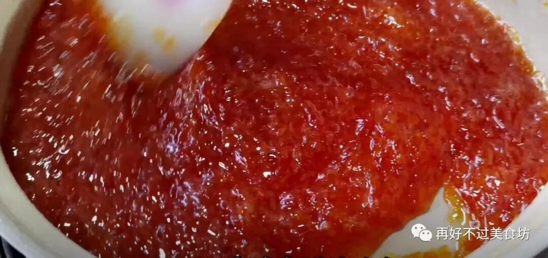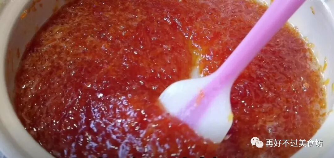 8、开小火不断地搅拌,全程一直开小火慢慢熬,熬到四十分钟后,水分慢慢煮干,颜色也变了,汤汁粘稠,再煮十分钟,等水分完全煮干。