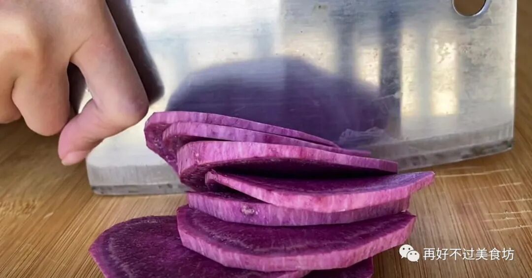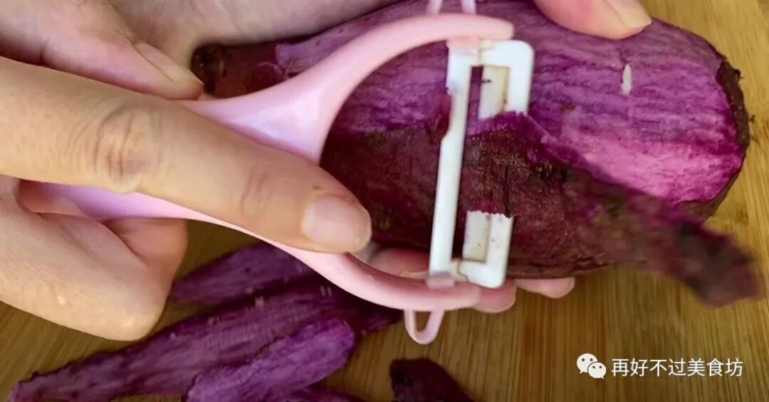 1、准备一个300克左右的紫薯,先用削皮刀把紫薯皮去掉,然后切成片,紫薯片尽量切得薄一些,这样蒸的时候熟得快。