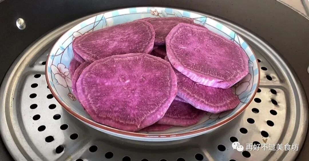 2、锅中加入适量的清水,把紫薯片放进来蒸一下,水开后,大概十分钟左右就可以了。