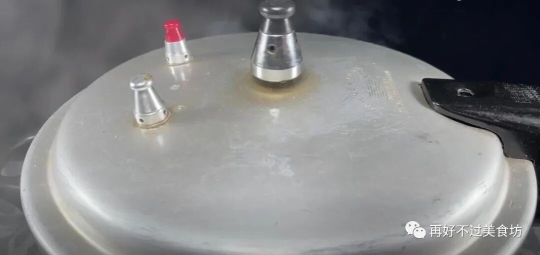 9、煮开后倒在高压锅中,热水刚刚没过猪蹄,然后盖上盖子,上汽后开中火压20分钟,20分钟后关火,再焖十分钟。