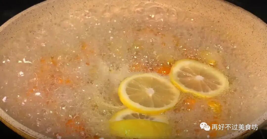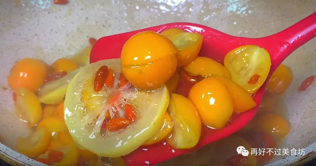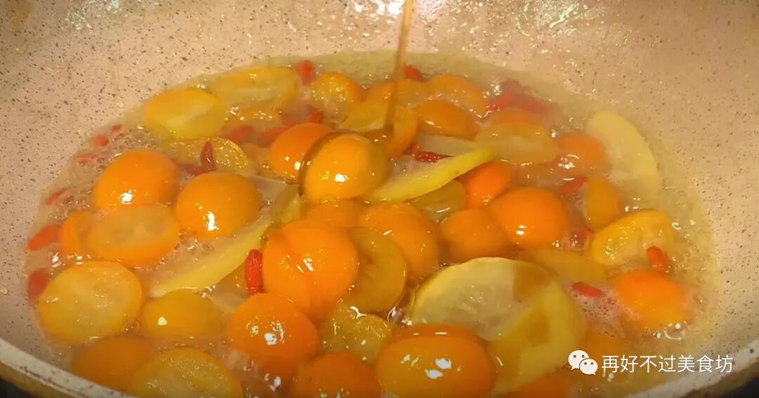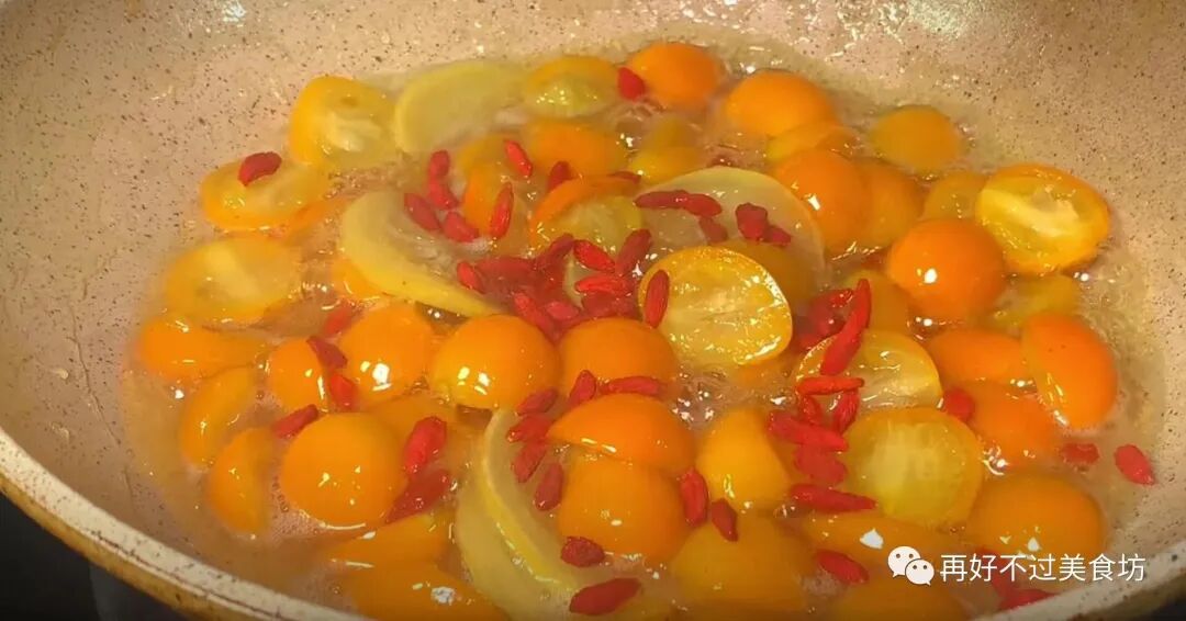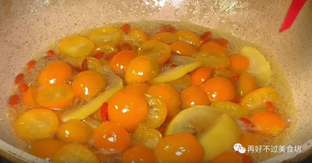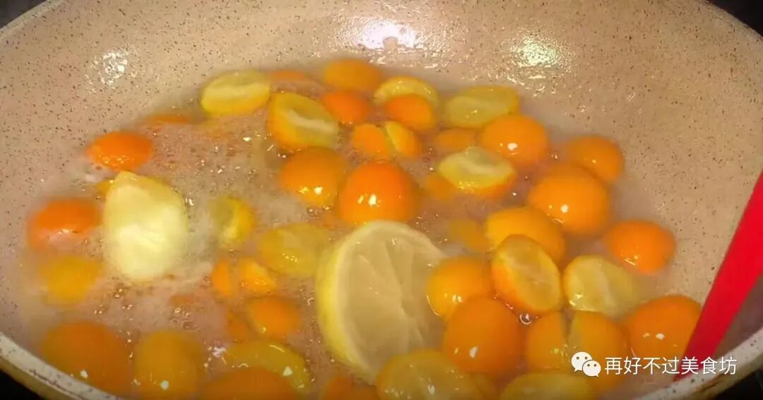 9、随着锅里的水分慢慢煮干,金桔里的养分也慢慢的释放出来,这个时候,就可以把柠檬加进来了,用铲子来回翻动,让其受热均匀,把柠檬也给煮熟。