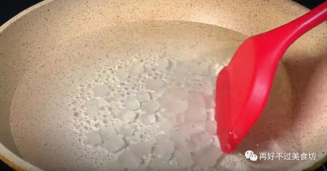 10、用铲子不停地翻动,让里面的糖浆变得均匀,以免粘在锅壁上变焦变黑,一直煮到里面的水分慢慢的收至浓稠,再加入一些枸杞,就继续翻动起来。