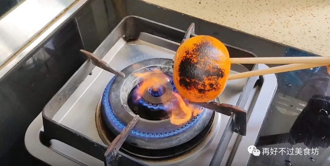2、下面准备2根筷子插入橘子中,然后放到煤气灶上,开始小火慢烤,中途需要不停地转圈,使其受热均匀,这个过程千万不要着急,要有耐心,要把它烤透。