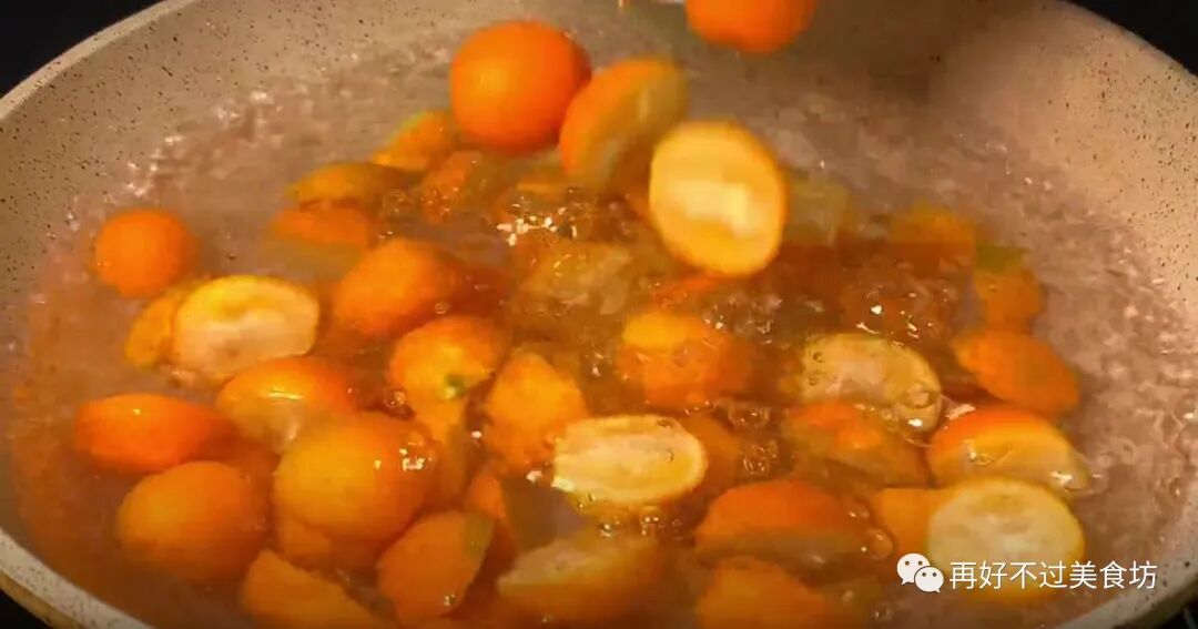 8、冰糖炒化之后,再把金桔倒入锅里面,然后继续开大火煮开,水要多加一点,中途不要再去加水,做这一道美食非常简单,不需要加任何的调料,只要将它煮透就可以了。