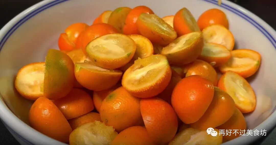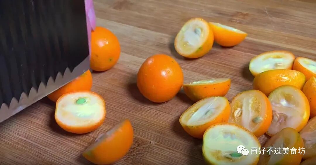 3、下面给金桔改一下刀,直接将所有金桔对半切开,金桔中含有丰富的维生素c,还含有一些维生素p,这两种维生素被人体吸收以后,可以增加血管的柔韧性,也能清除血管壁上积存的垃圾和毒素,其次金桔还有美容养颜、提高免疫力的作用。